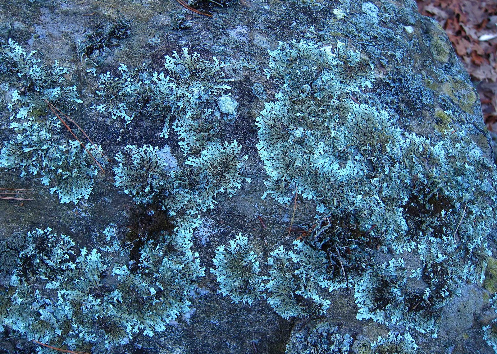 This streamside boulder, covered with Greenshield Lichen, appears to have been decorated with frosted Christmas greenery.