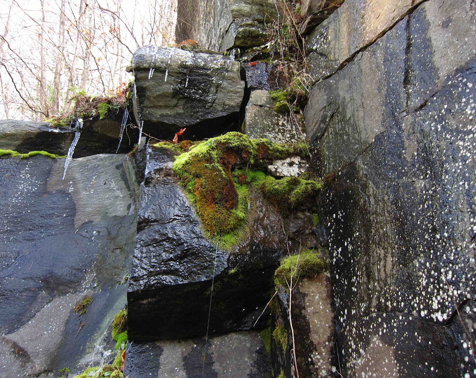 I often pull off the road by the dam, to explore the rocky cliffs that rise steeply up from the roadside there. The niches and cracks and shelves in these cliffs support lovely gardens of mosses and lichens, watered by springs that seep down the rocks, which today were cold enough to turn that dripping water into cascading icicles.