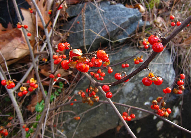 Normally, I truly hate Asiatic Bittersweet for its terrible habit of overwhelming native trees with its masses of strangling vines. But who could not be struck with delight by the sight of these ruby orbs turned luminous as Christmas lights by a ray of late-day sun?