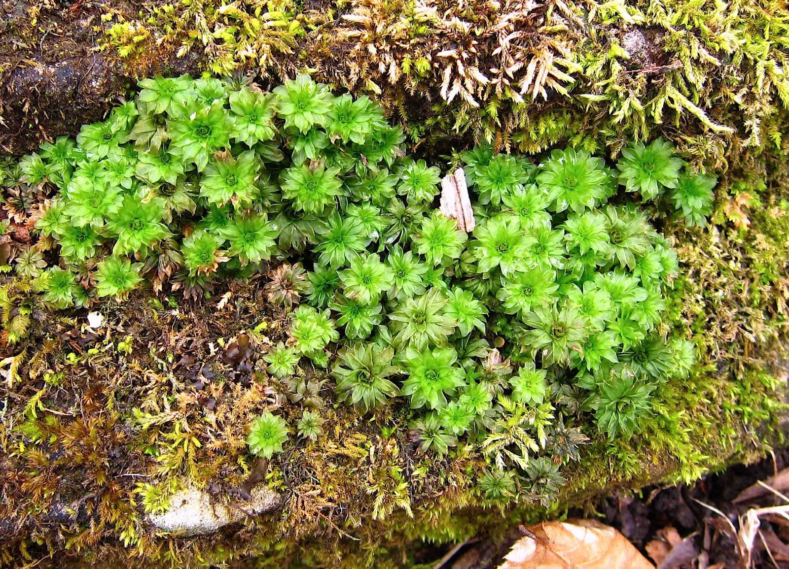 Some people have suggested that these caves are the remains of old graphite mines, but I tend to believe they were formed by underground streams hollowing out the limestone bedrock. To me, they just don't look as if they were made by human excavation. The presence of lime in the rocks is evident by much of the vegetation growing on them, including this splendid patch of moss called Rhodobryum roseum, a leafy moss that prefers a limestone base.