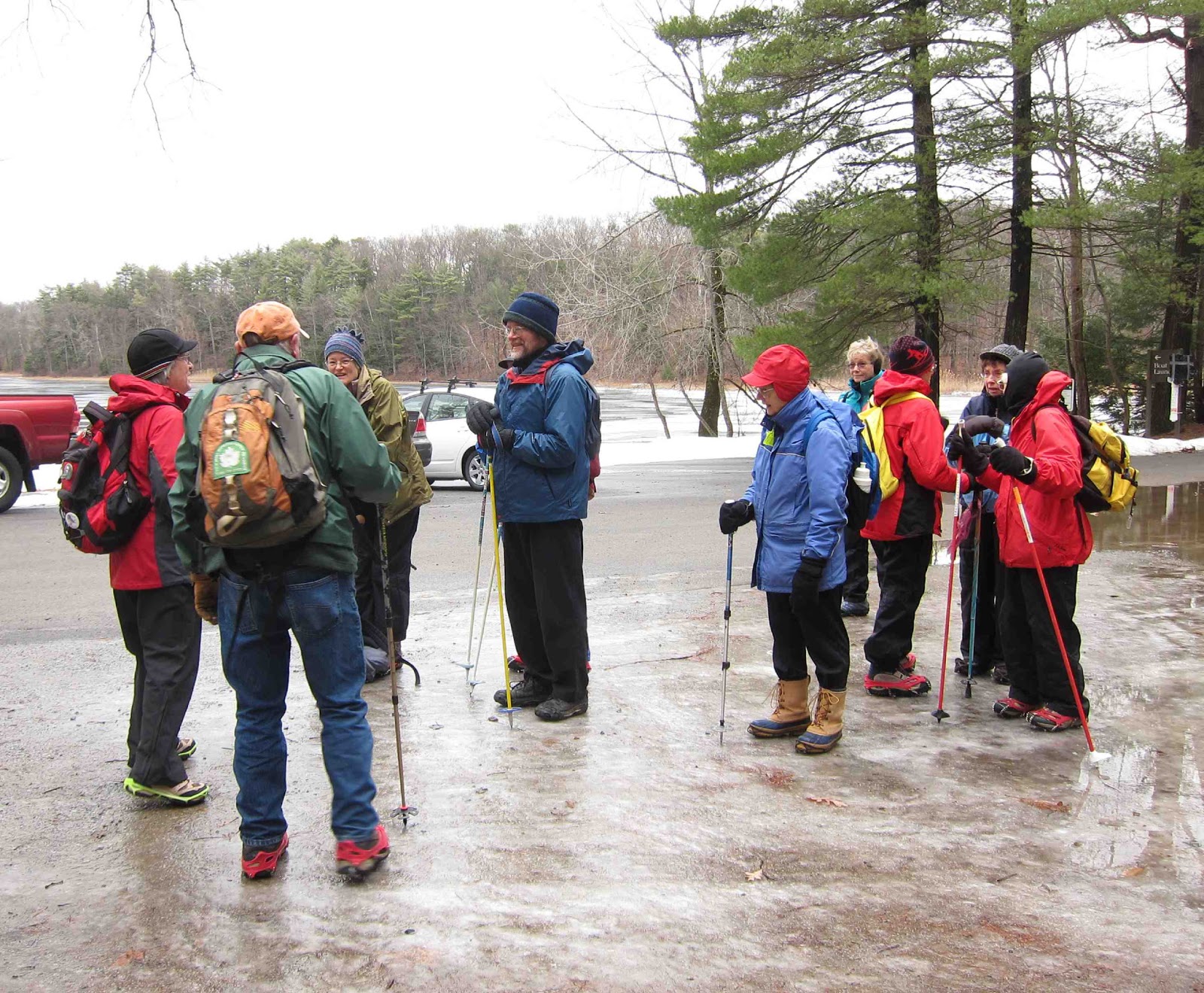 The weather this week was not conducive to outdoor adventuring: rainy and mild most days, with temperatures reaching into the 50s, first making a mess of all our nice snow, then washing it all away. But a raging wind moved in last night, issuing in blasts of frigid air that kept blowing ever colder as the day wore on. The forecast this morning was hardly promising for a walk in the woods, with wind gusts predicted to reach 50 miles per hour or more. I wondered if my friends in the Thursday Naturalists would cancel their plans to climb up the mountains in Moreau Lake State Park to explore some caves where porcupines make their dens. But not THIS group of hardy folks! No sir! This group of passionate nature lovers came dressed for the weather with warm coats and hats and with spikes on their feet for climbing icy trails.