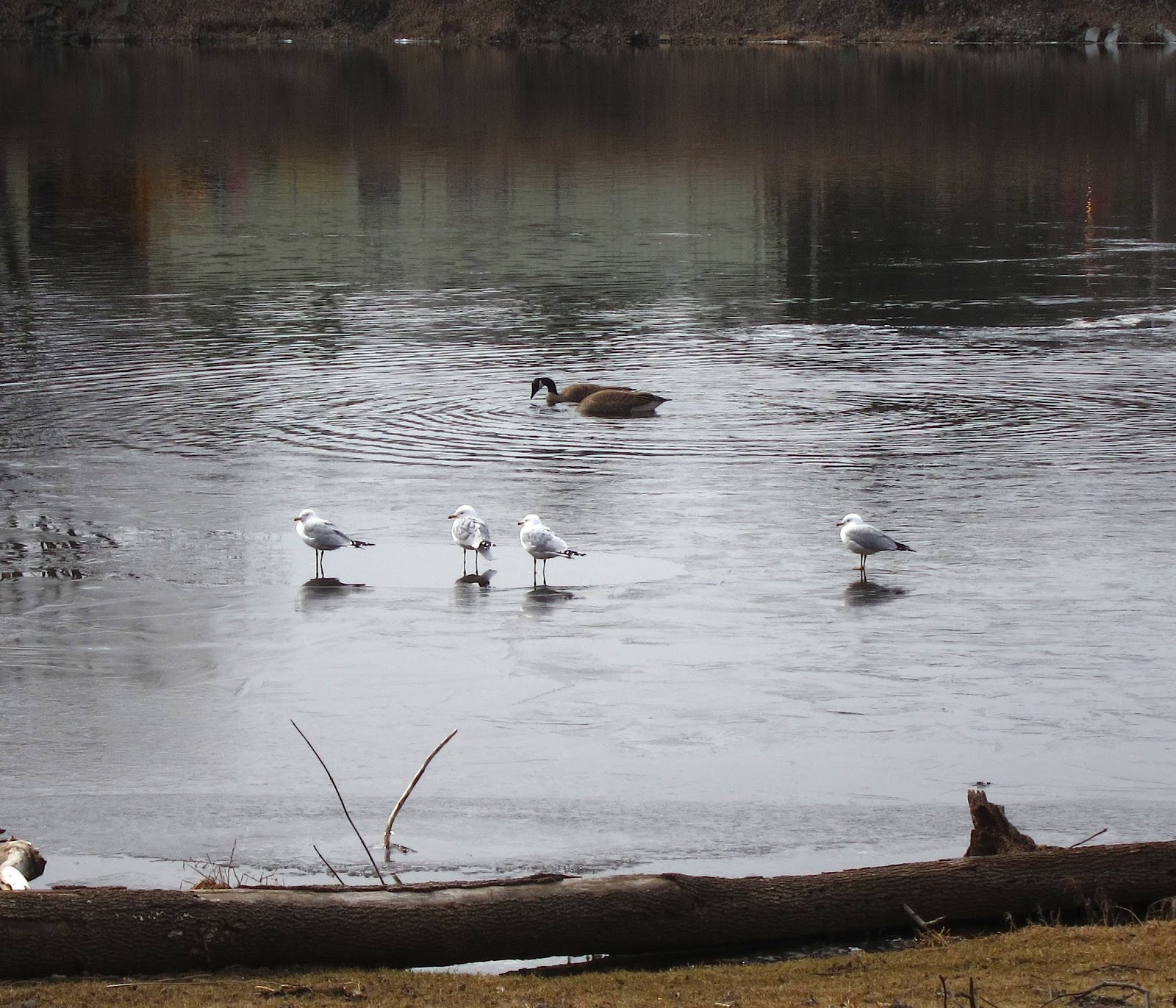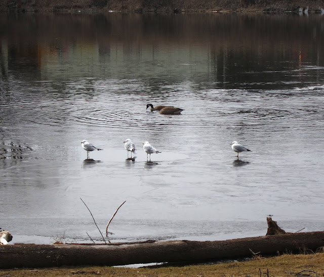 Of course, the old regulars were well in evidence. Gulls and geese hang around the river all winter, just as the cardinals and robins do. I did take a second look at these gulls, though, when it looked as if they were walking on water. Turns out there was just a sheet of new ice close to shore, which was covered with a thin layer of water.