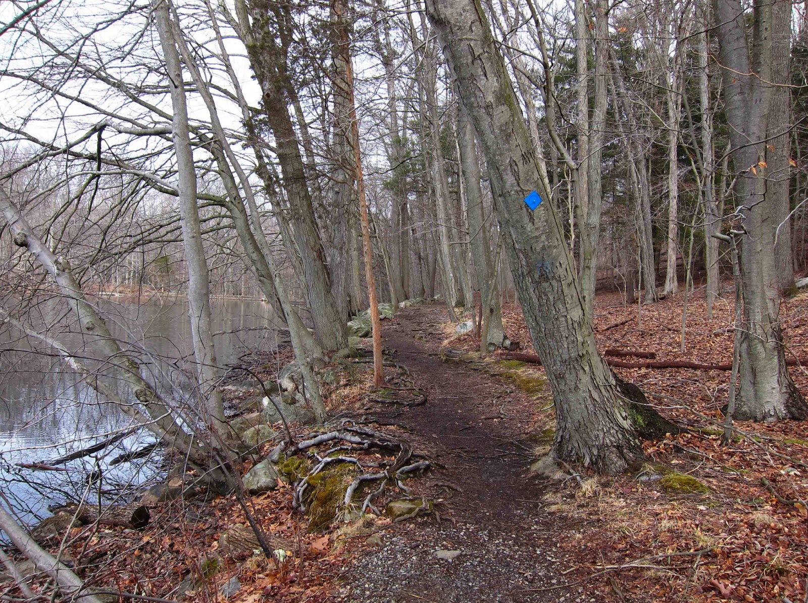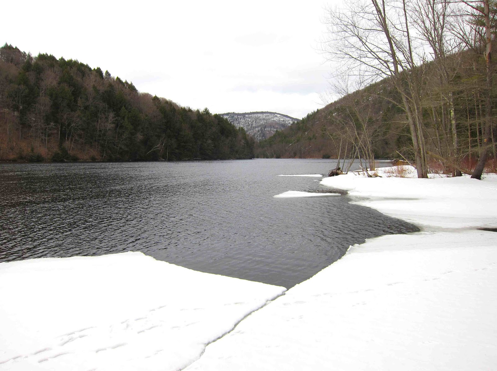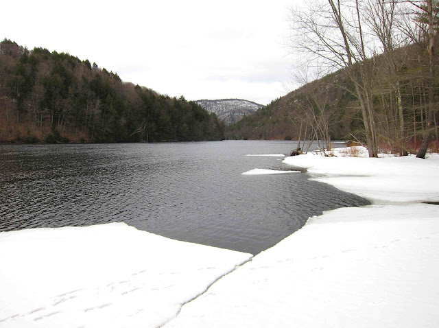 March? It's March already?! Gosh, here I am, still waiting for winter, and all of a sudden it's almost spring. I was away caring for my granddaughters most of last week, down in Westchester County, and it did start to feel like spring down there, with temps in the 40s most days and lots of rain. We did have one fairly pleasant day with no rain, so after I put the girls on the schoolbus, I hurried over to Teatown Reservation, a nature preserve near Ossining, and hiked around the lake. As this photo shows, there's not a trace of snow left in the woods down there, and the ice has retreated quite a ways from shore.