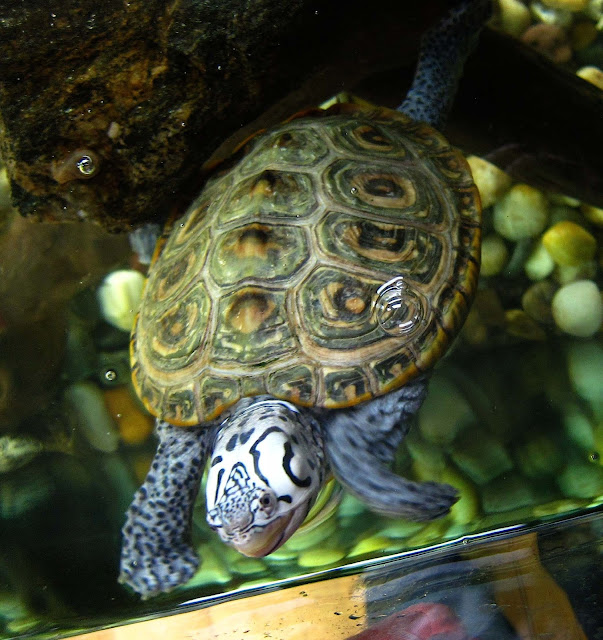 This is one turtle I'm never going to see up in Saratoga County, since it lives only in the brackish waters of coastal salt marshes, tidal creeks, and estuaries, coming ashore only to nest. One interesting fact I learned is that the gender of its offspring is determined by the temperature of its nest site, with cooler nests producing males and warmer nests producing females.