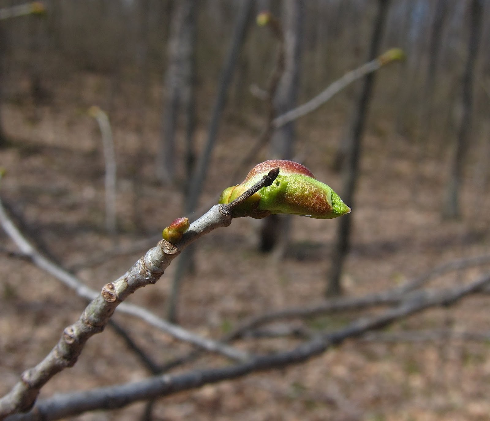 I wasn't sure if these lop-sided leaf buds were those of American Basswood, whose heart-shaped leaves will be equally lop-sided. So I looked on the internet, where I found basswood buds described as looking like "mice wearing red motorcycle helmets." Yeah, that works. I also learned that the buds are quite tasty and sweet. I'll be sure to try them next time I find them.