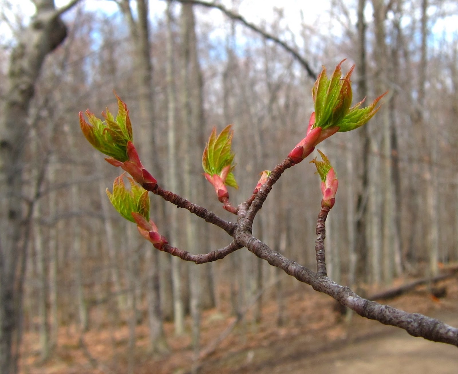 These Red Maple sprouts were confetti-bright, the yellow-green baby leaves erupting from bud scales the color of bubblegum.