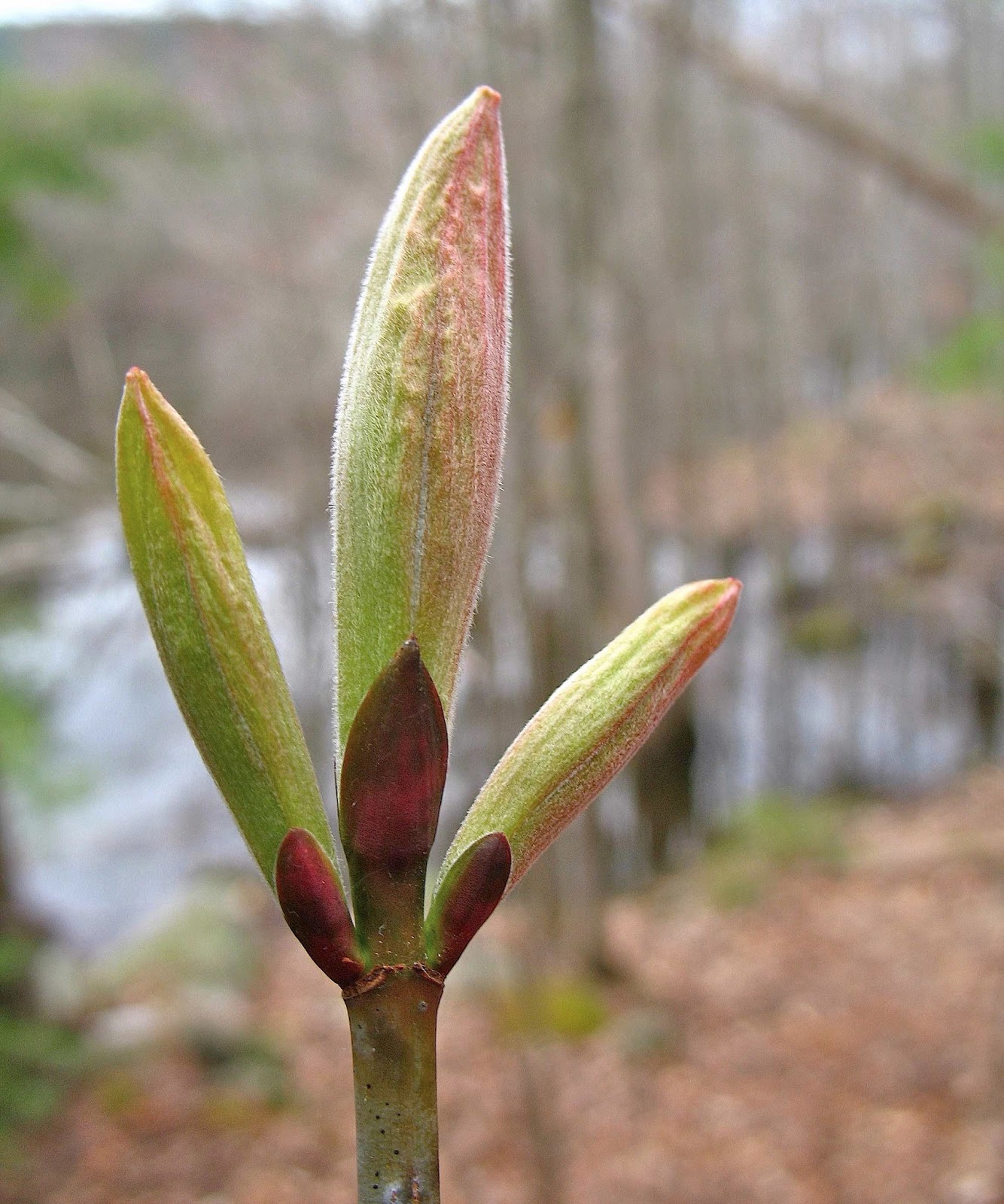 Of more subtle, but equally beautiful coloration, was this trident of Striped Maple, its pillowy green-velvet leaf buds blushed with pink..