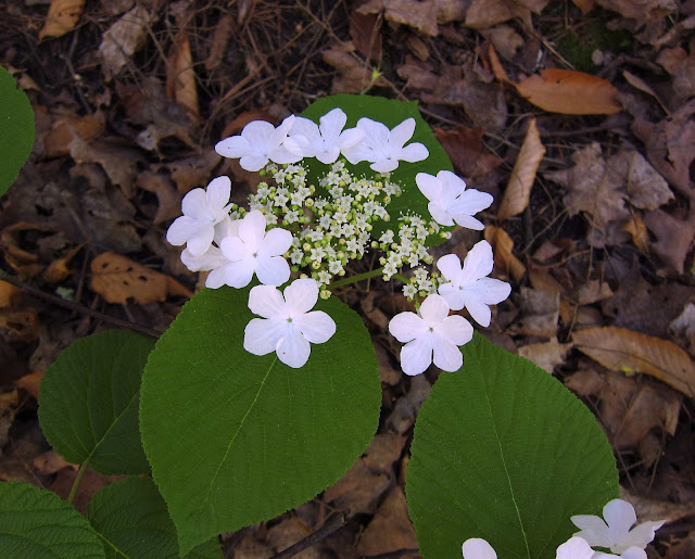 These newly planted species join the long-established wildflowers that grow along this trail. Red Trillium, Small-flowered Crowfoot, and Jack-in-the-pulpit were blooming on Sunday, but the showiest flowers of all were on the Hobblebush shrubs that grow on the banks and lean their branches over the trail so that I could enjoy a close-up view of their pristine white flowers.