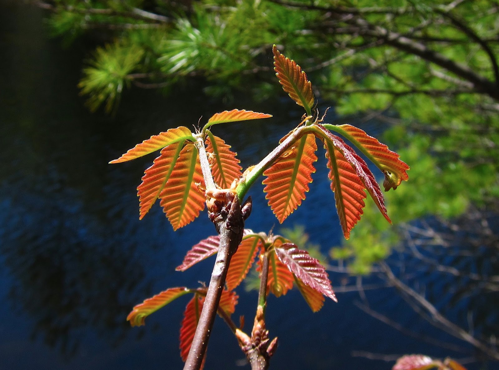 I pulled my boat up onto a little rocky island and walked about on its mossy ground. From inside a grove of overhanging trees already well in leaf, I was struck by the vivid stained-glass glow of these baby Chestnut Oak leaves backlit by the sun.