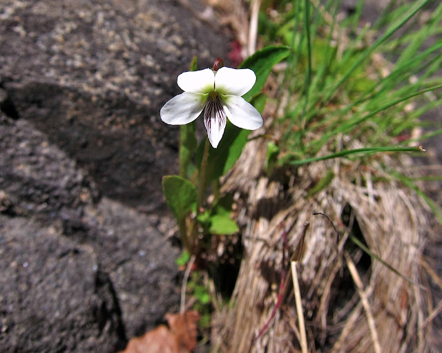 When I passed by a certain niche in a rock where I know to look for Lance-leaved Violets, I was surprised to find its slender white flowers already in bloom. Because this patch of violets grows so close to the water's edge, I usually don't look to find them until June, after the river has subsided from its spring flood. We haven't had much rain this spring, nor snow this past winter, so consequently, no spring flood.