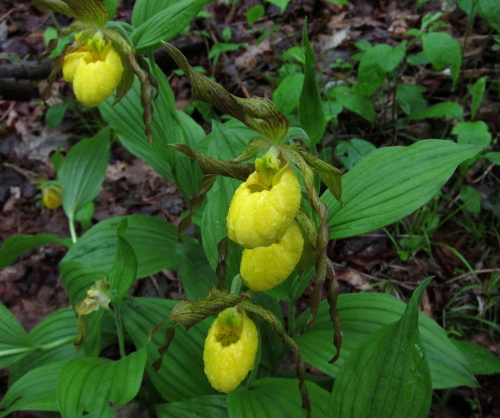 We found hints to the botanical riches awaiting us at the top as soon as we started up the trail, so we knew that our climbing efforts would soon be rewarded. Sure enough, just as we began to feel out of breath, we came upon this splendid cluster of Yellow Lady's Slippers (Cypripedium parvifloram var. pubescens) blooming right next to the trail.