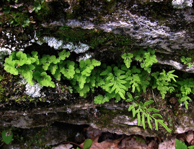 Climbing higher and higher, we passed beneath rocky outcroppings studded with many rare plants, including a healthy population of Slender Cliff Brake (Cryptogramma stelleri), a fern that can only be found on lime-rich substrates like marble.