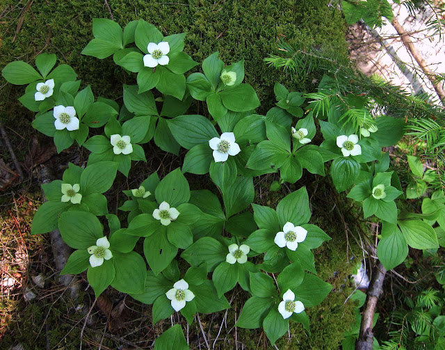Although the Hooker's experience was the definite highlight of our afternoon's adventure, we also encountered other delights along the trail to the orchid site, including two more plants on Andrew's list of hoped-for plants. Bunchberry (Cornus canadensis) was just beginning to bloom and still showed more green than white on its opening sepals, but that was good enough for Andrew to count it among his captured prizes.