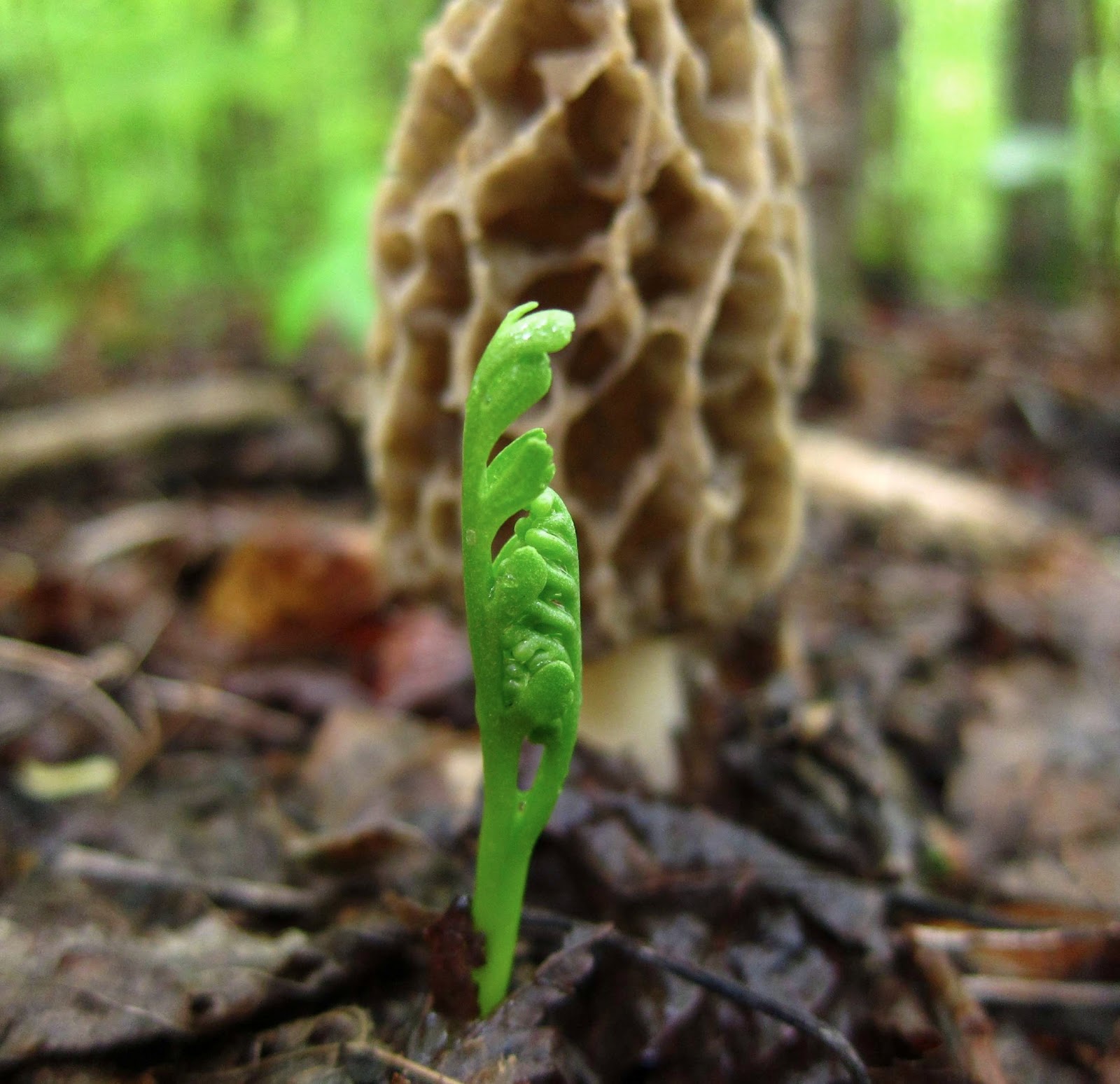 Here's one of the larger ones, set off quite nicely by a nice fat Morel mushroom, which we of course took home to fry up in butter for supper, along with other Morels we gathered nearby.