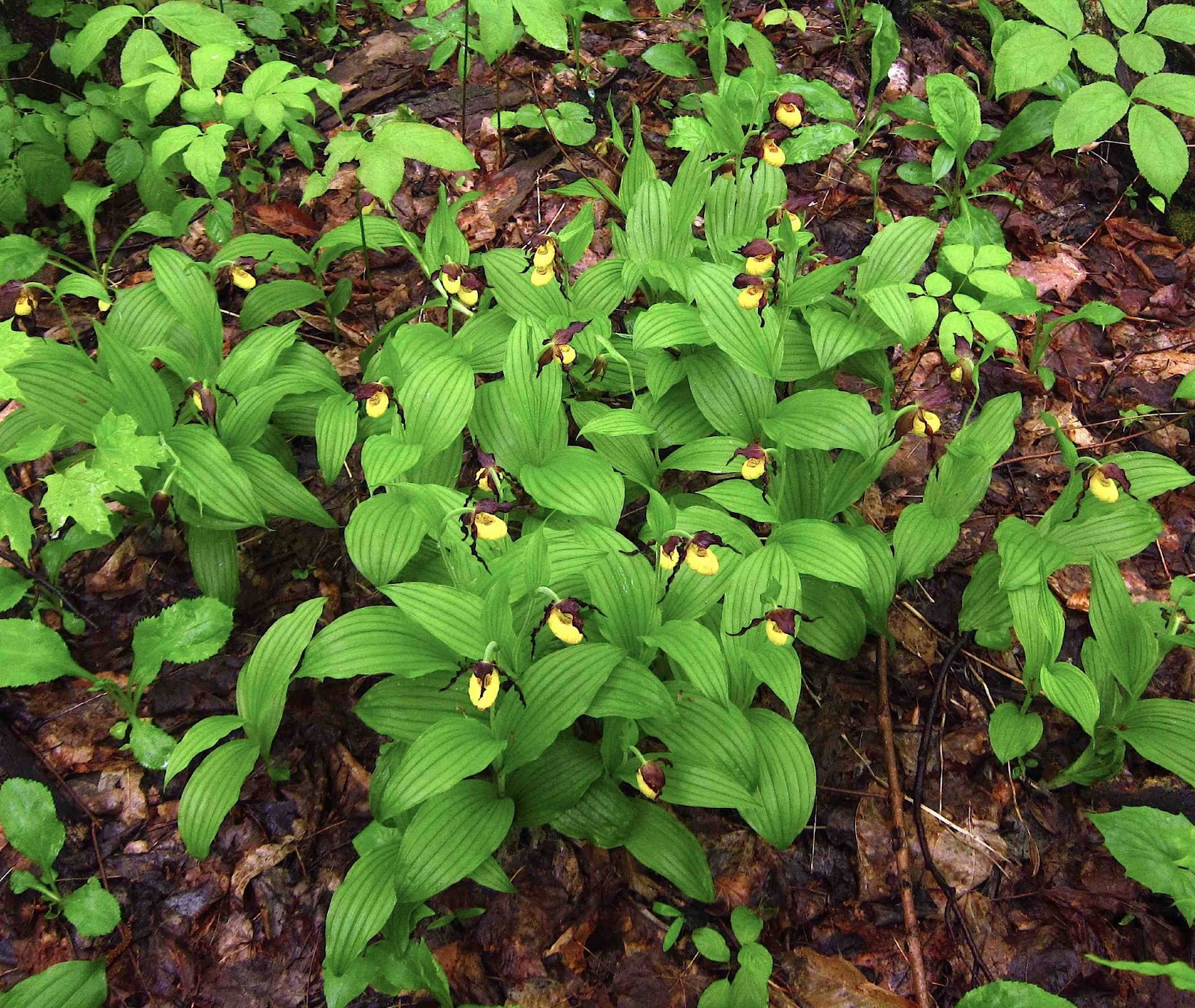 Even more abundant were the masses of Smaller Yellow Lady's Slippers (C. parvafloram var. makasin) that extended for acres throughout the woods. In addition to its smaller size, this variety is distinguished from the Larger Yellow Lady's Slipper by the purple color of its petals, which are greener in the larger variety.