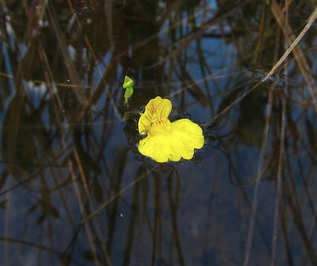 As for myself, I was particularly delighted to find the bright-yellow flowers of Flat-leaved Bladderwort (Utricularia intermedia) protruding above the dark water near the edge of the bogmat. It's not that this bladderwort is all that rare, but because it blooms so early, I hardly ever see it. And it really is a pretty one, too, with those fine red lines decorating its plump little blooms.