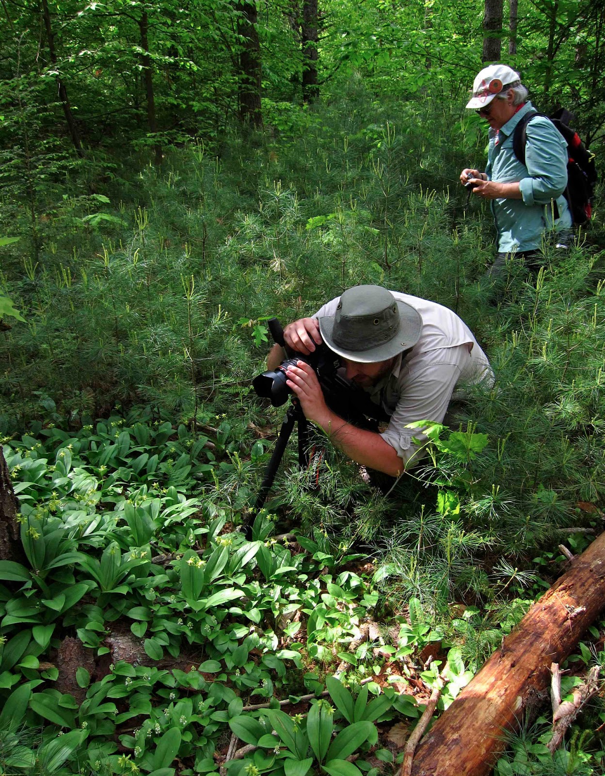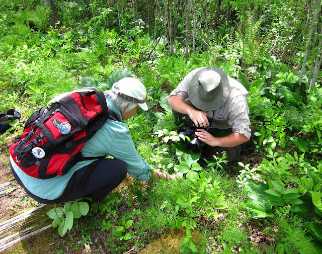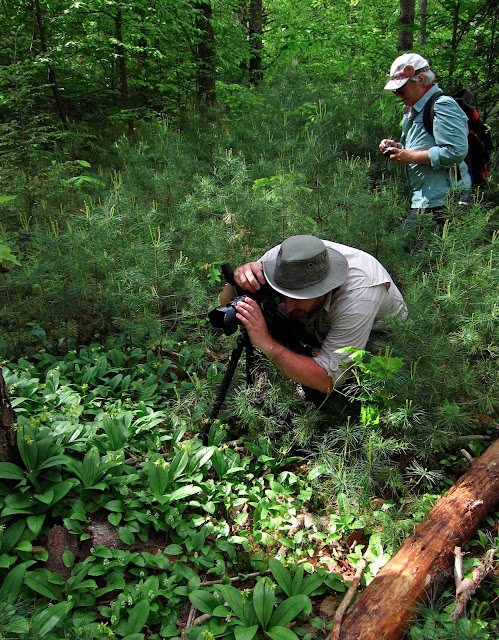 As wonderful as our morning paddle was, with its many rare and beautiful flower finds, the prize of all botanical prizes awaited us later in the afternoon. That's when another friend, Bob Duncan, led Andrew and Sue and me for over a mile through deep Adirondack forest to the rarest of all the rare plants Andrew dreamed of finding and photographing, the Hooker's Orchid (Platanthera hookeri).