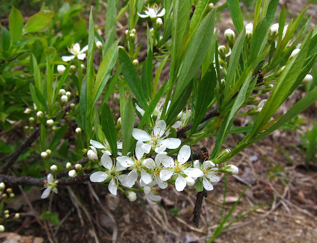 Dwarf Sand Cherry (Prunus pumila var. depressa), though, was abundantly in flower and adding its sweet fragrance to the air. This prostrate cherry, which is considered a rare plant in New York, thrives in the harsh conditions caused by the massive heaps of ice that cover this shore each winter, suppressing the growth of taller trees that would compete with it.