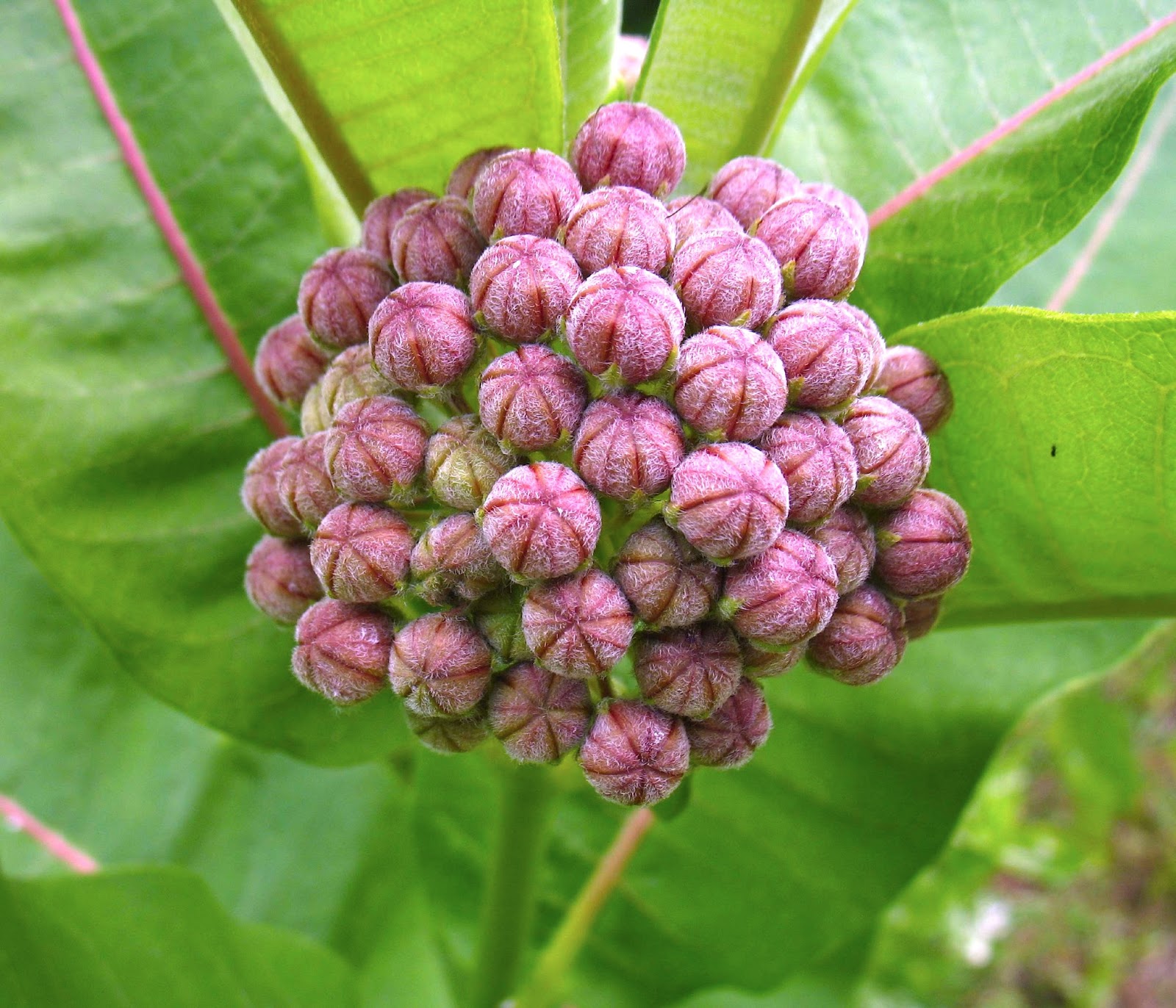 Although many plants of Common Milkweed (Asclepias syrica) are already blooming and filling the air with a heady fragrance, I was drawn to admire the pink-velvet beauty of this cluster of buds.
