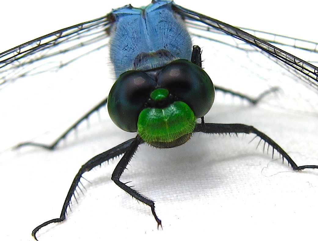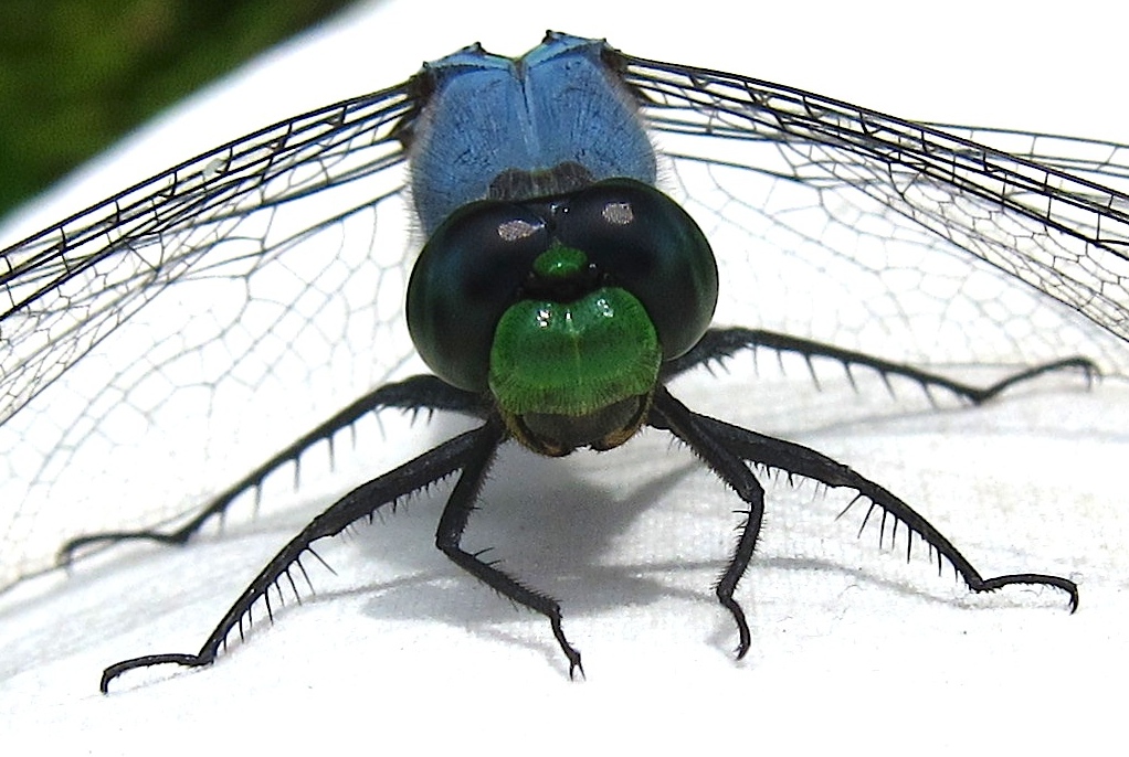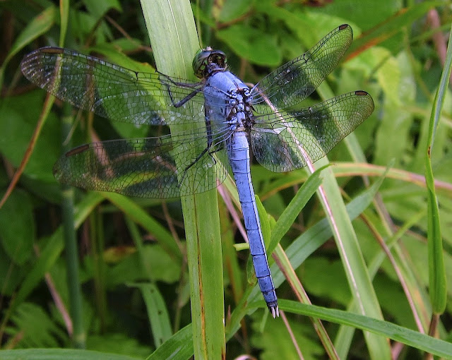 Ah well, all God's chillen gotta eat! And here's another predator, a male Eastern Pondhawk dragonfly, perched on a blade of grass while he surveys the scene for small insects to snag and devour. This carnivore is a little prettier than that Jagged Ambush Bug, with his lacy wings, powder-blue thorax and abdomen, big black eyes, and bright-green face.