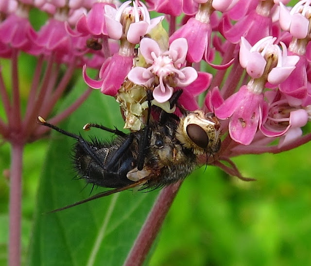 As I bent to admire the bi-color florets, I noticed a big furry-bodied tachinid fly dangling there. Oh dear, I thought, the milkweed's pollen bundles have trapped another pollinator, as milkweeds are known to do, when an insect's leg slips into a slot in the flower's pistil and can't work itself free. I turned the floret over to see if perhaps I could help the fly escape, only to discover that the fly was way beyond my help. And I also discovered the real cause of the fly's demise, and it wasn't death by pollinia. Do you see that pale greenish creature with its Popeye-enormous forearms and bulging eyes and its mouthparts sucking away at the fly's underbelly?