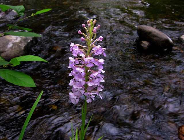 Well, I thought, if Goodyera are blooming, I'll bet the Purple Fringed Orchids (Platanthera psycodes) are blooming, too. So I next headed north to Lake Luzerne, where I know of an island where these spectacular orchids will sometimes grow thick as dandelions. Last summer I found 20 perfect blooms on a patch of grass about the size of an average living-room rug. Today I found five. There may be more not yet in bud still hiding in the grass, but not that I could find. Of the five I found today, this one was the most fully in bloom and looking truly exquisite silhouetted against the dark water of the rushing stream.