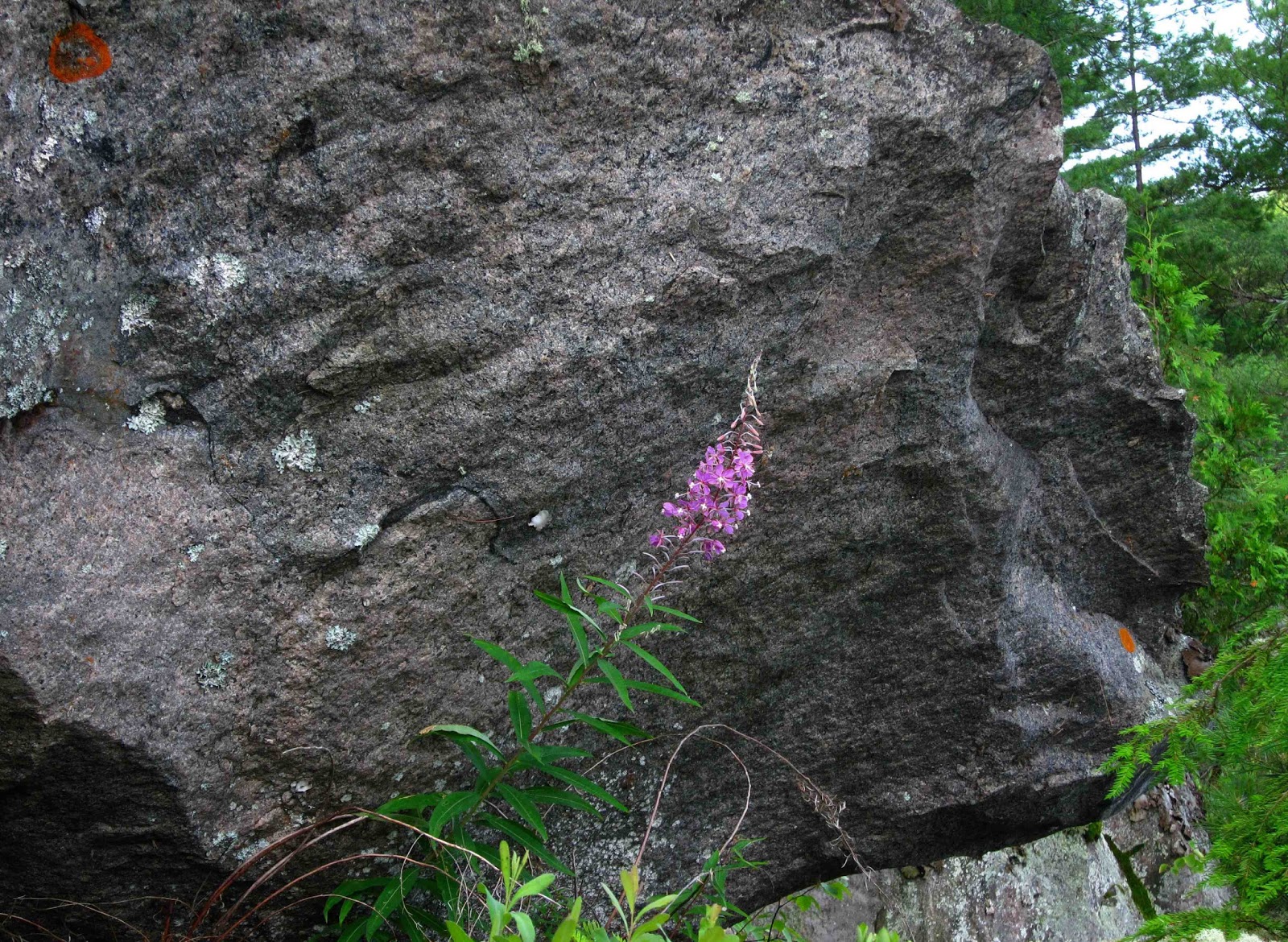 Nestled in among these boulders was a single stalk of Fireweed (Epilobium angustifolium), its bright purple flower spike set off to fine advantage by the gray of the sheltering rock.