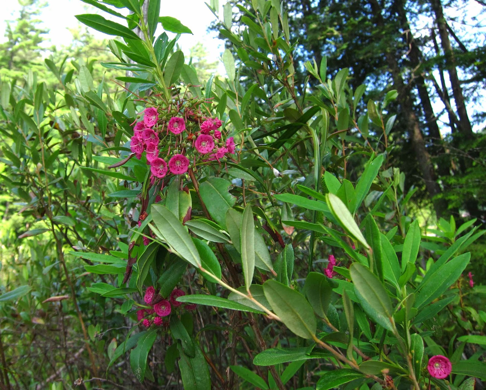 Also here in these swampy areas, deep-pink clusters of Sheep Laurel stood out against the green.