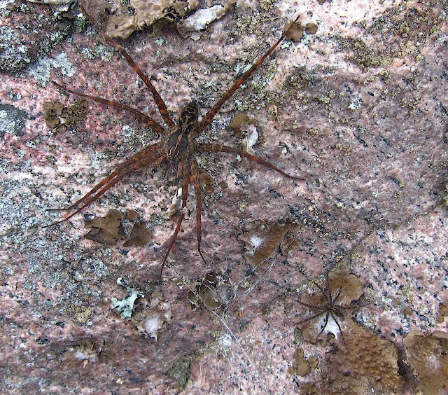 Huge Fishing Spiders inhabit these boulders, sometimes dropping straight down into the water to pursue the tiny fish that are its prey. There must have been a recent hatch of baby spiders, for a number of miniature versions of this big one were skittering across the face of the rock. There is one of the little ones in this photo, at lower right. (By the way, this photo presents the big spider just about life size.)