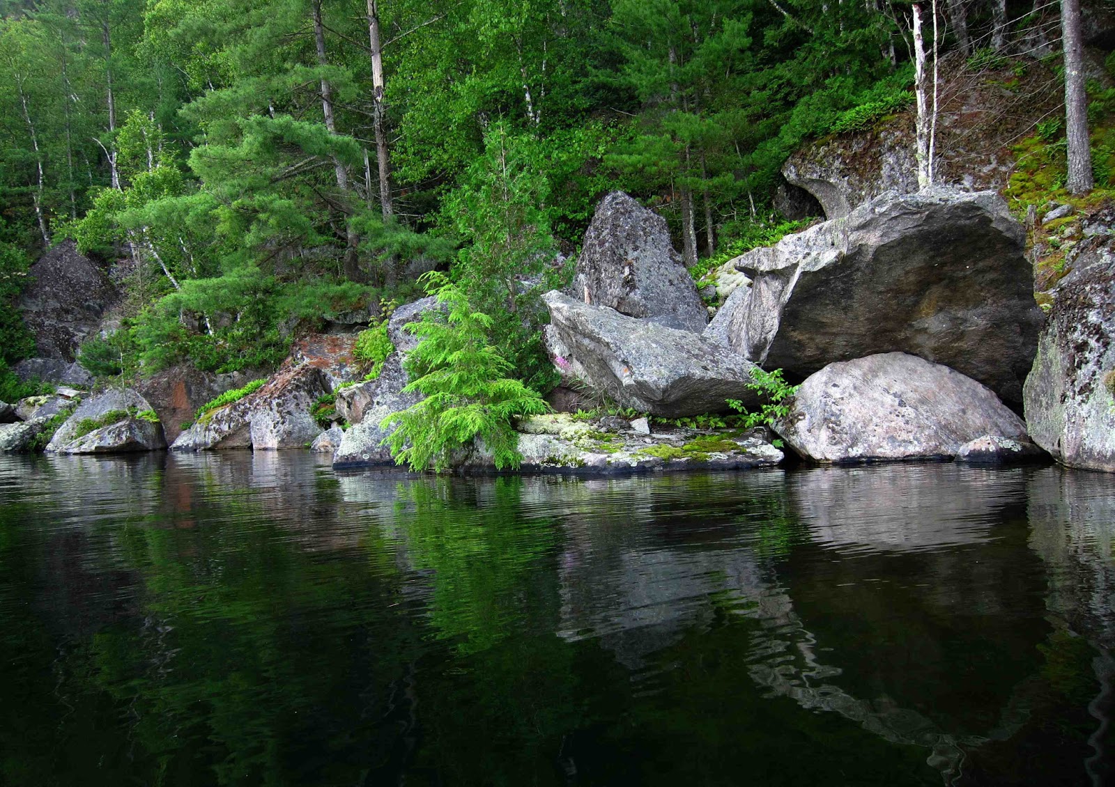I enjoyed paddling close to the foot of dramatic cliffs, from which huge boulders had tumbled down to the shore. From deep in that green forest, a Winter Wren sent his exquisite fluting, warbling, trilling song out across the water.
