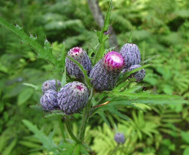 Newcomb's Wildflower Guide describes our native Swamp Thistle (Cirsium muticum) as "common," but I sure don't think of it as all that common, since Bog Meadow is the only place I have ever encountered it. And I explore quite a few swamps. It wasn't quite in bloom on my visit this week, but it did have a fringe of its beautiful purple petals pushing out of its distinctive flower heads. If you click on this photo, you may be able to see the fine white hairs that give a cobwebby appearance to them.
