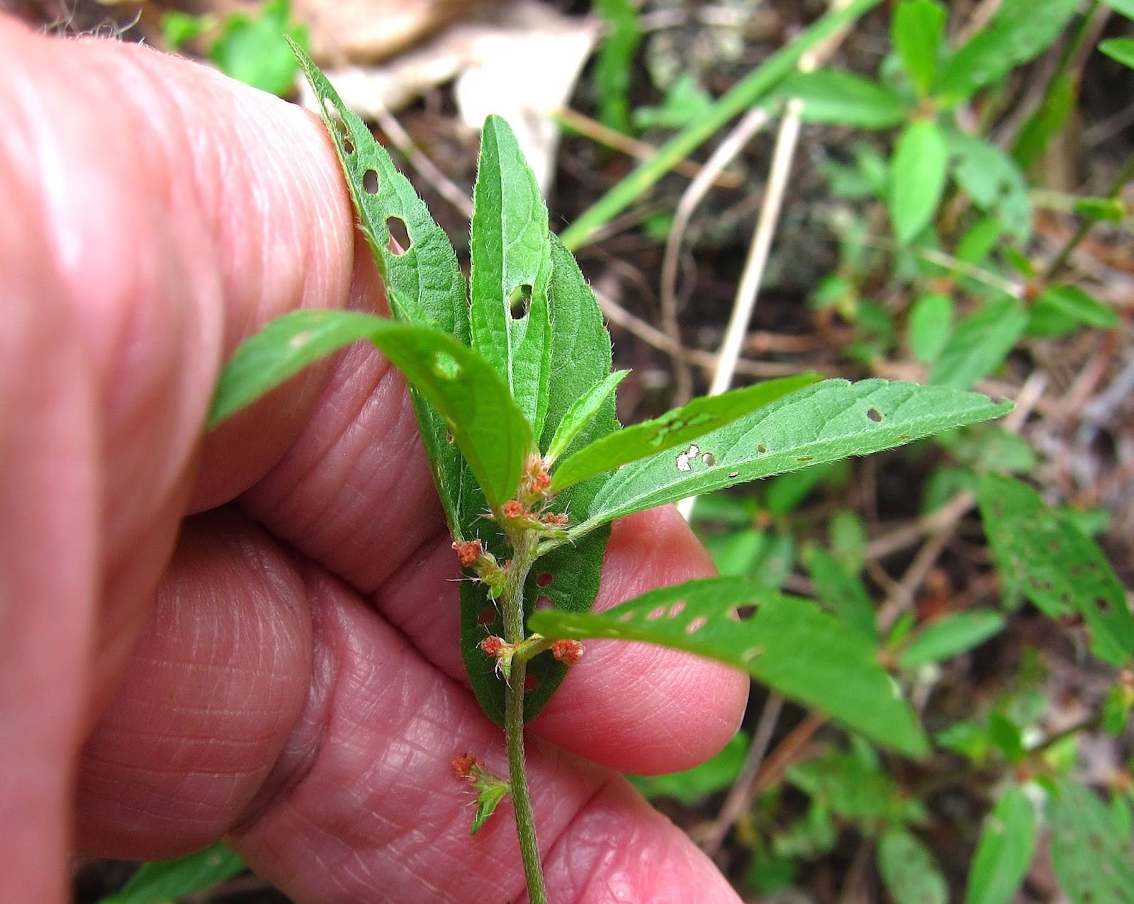 Well, I doubt many people would think of this next plant as all that pretty, especially when riddled with holes. But it is kind of special to me. This is Slender Three-seeded Mercury (Acalypha gracilens), and distribution maps show it as having been reported in only a few counties in New York State. Now, that may be because it's easy to overlook, rather than because it is rare. But I got kind of excited when I first identified it four years ago, because I was the first to have reported finding it in Warren County. My very first specimen collection. And I still find it every year, right where I found it first.