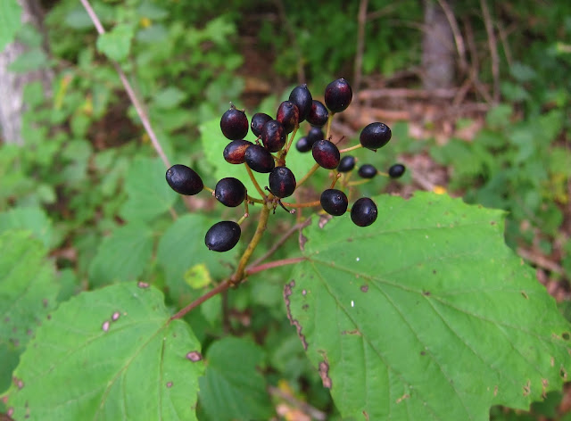 More subtle in their coloration (for now), the berries of Maple-leaf Viburnum are turning their deep blue-black. This small shrub will be very easy to spot in a month or so, when its foliage turns a most distinctive shade of purplish coral, a color unmatched by any other foliage in the woods.