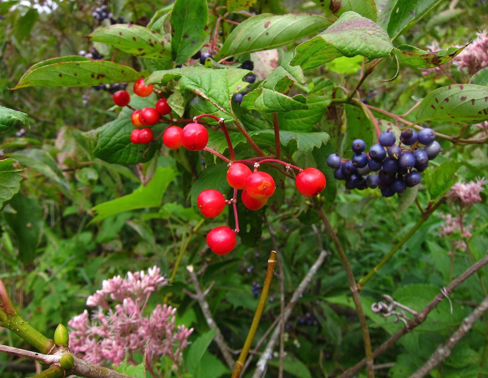 The season of "mellow fruitfulness" is well upon us, with many shrubs heavy with berry clusters. Here was a pretty coincidence of bright-red Highbush Cranberry fruits intermixed with branches bearing the deep-blue fruits of Silky Dogwood. A bit of Joe-Pye Weed added its rosy color to the mix.