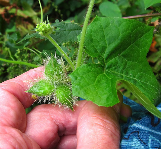 Our trail was crowded close with many other summer flowers: Pale-leaved Sunflowers, Tall Goldenrod, Green Coneflowers, Spottted and Pale Jewelweed, Boneset, Virgin's Bower, and both Wild Cucumber and One-seeded Bur Cucumber, the two gourds each now in fruit as well as in flower.