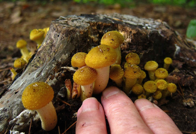 We found dozens and dozens of these gold-capped buttons throughout the woods. I believe they are Honey Mushrooms (Armillaria mellea), an edible species. But since I wasn't sure, I did not gather any to take home.