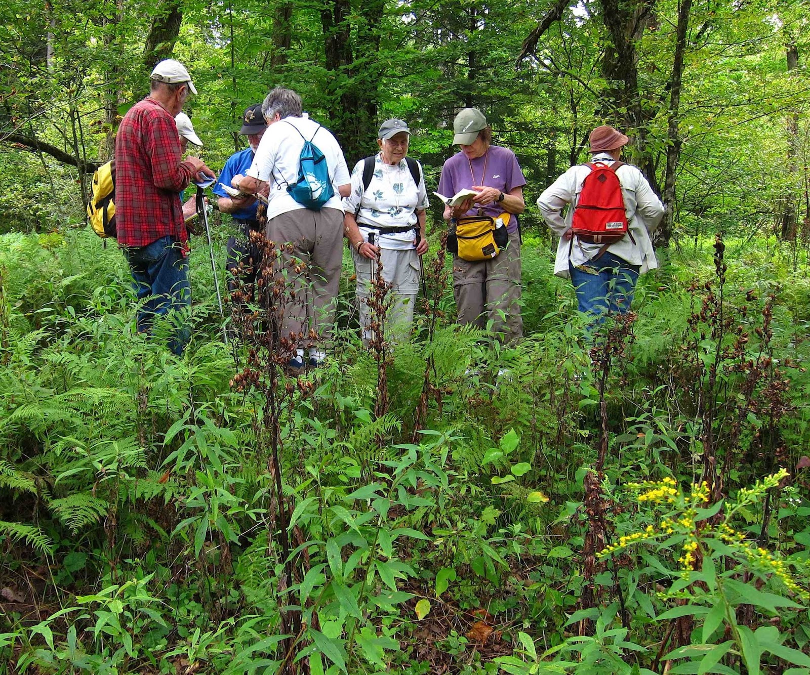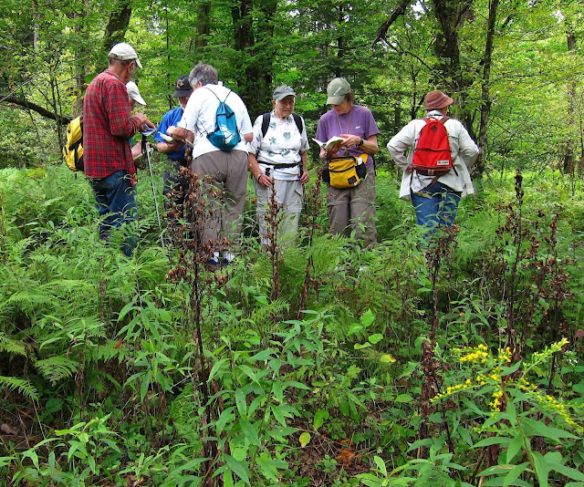 This photo shows my friends making their way along the trail that has been mowed through thickets of shrubbery. Unfortunately for me (I was wearing short pants and low socks), the Wood Nettles had grown back to mid-shin height in many places, and my ankles suffered the rest of the day from many stings. Next time, I will take my cue from my friends and wear long pants and heavy socks.