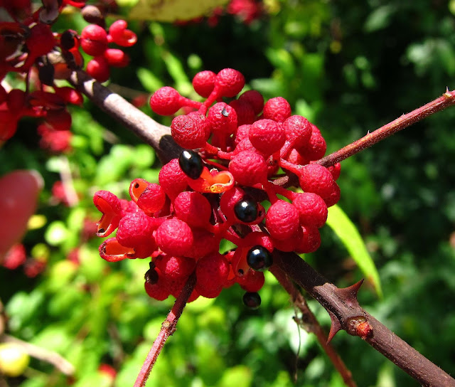 The Northern Prickly Ash (Zanthoxylum americanum) was in spectacular color, too, especially when the sunlight picked out the clusters of bright red berries that were just beginning to spit open to reveal its shiny black seeds. When I picked one of these clusters to take a closer look, I was struck by the strong citrus odor of the fruit, reminding me that our friend Ed Miller had told us that this small tree is our only example of citrus that grows this far north. Do take a sniff if you find this tree in fruit. The smell reminded me of fresh-squeezed limeade. But don't try to taste it, or your mouth will go numb for a while. Another common name for this species is Toothache Tree.