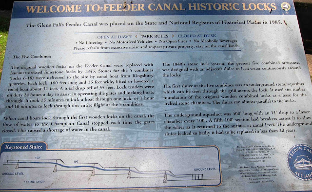 What a day for a streamside walk! The day was warm, the air was light and dry, the sun was bright, the sky was blue, and my friend Sue knew just the place for a wonderful stroll along an old canal. And a quite dramatic canal, it was, with water plunging through what remains of a series of old locks called "The Five Combines" on the Feeder Canal in Hudson Falls, in Washington County.