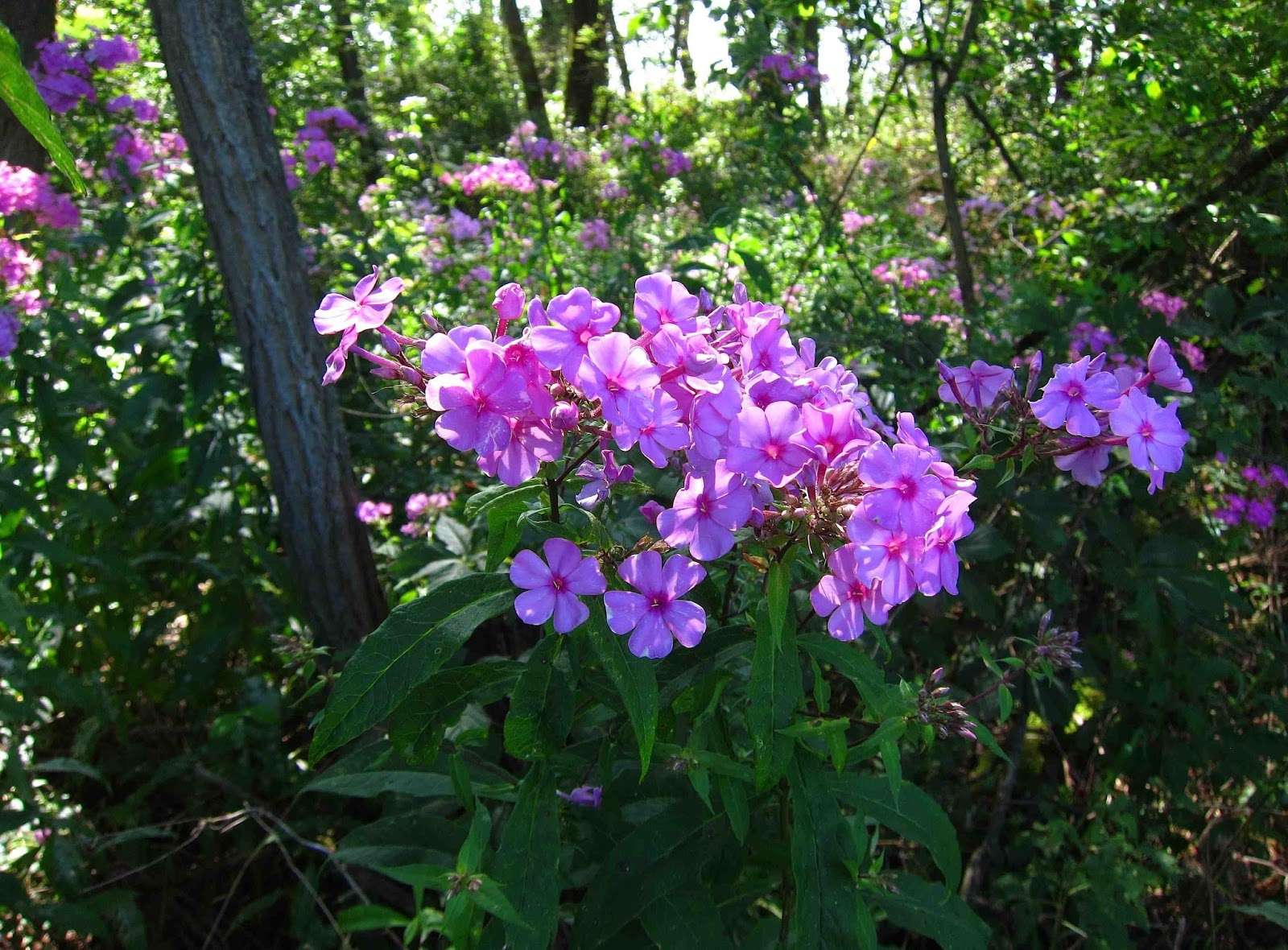 We could smell the fragrance of this patch of Garden Phlox (Phlox paniculata) before we even saw it, although its intense color would have been hard to miss. What WAS easy to miss was the spectacular Giant Swallowtail Butterfly that came flitting and wafting through this patch of garden escapees. Try as we might, we could not capture its beauty in a photo, it moved so quickly among the blooms and then soared away out of sight. This is a more southerly species of butterfly than we're used to seeing, although we did see one last summer, too. That time, it was puddling in mud and stood very still for the picture taking. Click here and you can see how big and beautiful it is.