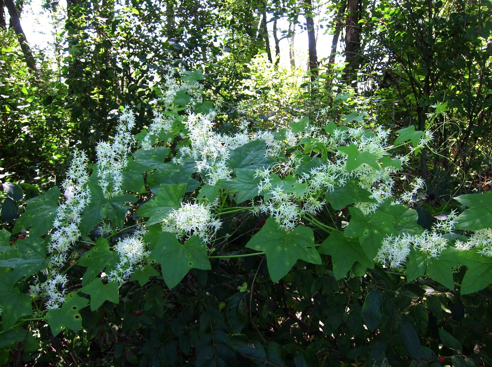 The frothy cream-colored blooms of Wild Cucumber (Echinocystis lobata) were climbing over many trailside shrubs.