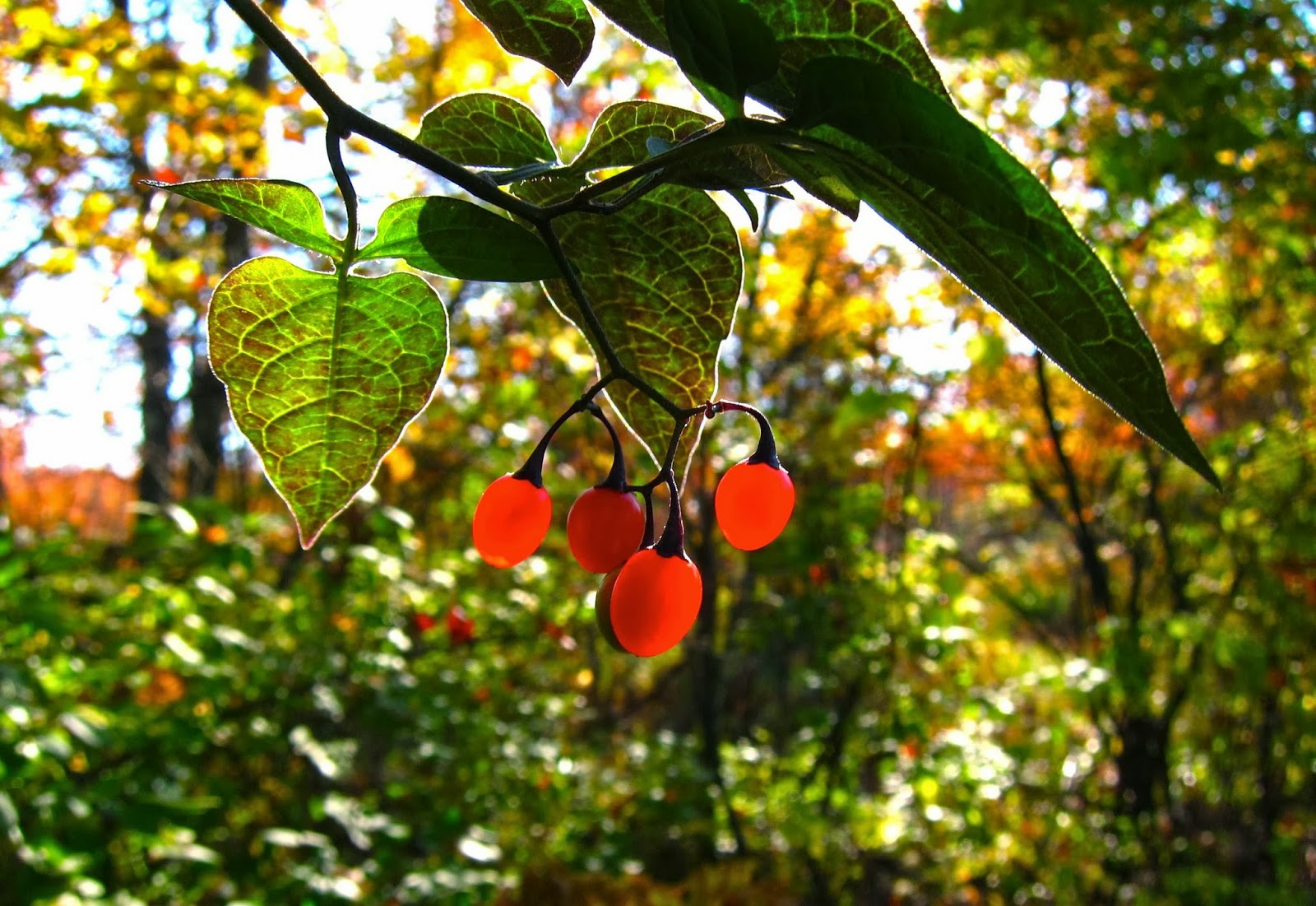 The late-afternoon sun was at just the right angle to light up the dangling Bittersweet Nightshade berries like glowing lamps.