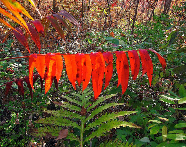 A single branch of Staghorn Sumac burned like a flaming torch, when backlit by the sun.