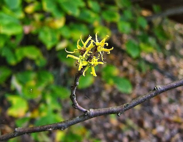 At least I was consoled by the sight of the Witch Hazel blooming at last.  Its cheerful yellow raggedy ribbons of bloom will stay with us now until long after frost, the narrow petals curling up tight on cold days but unfurling again when warmed by the sun.  These flowers have the most delicious but subtle scent, like clean laundry fresh from the clothesline, touched with a trace of citron.