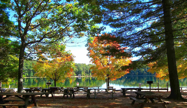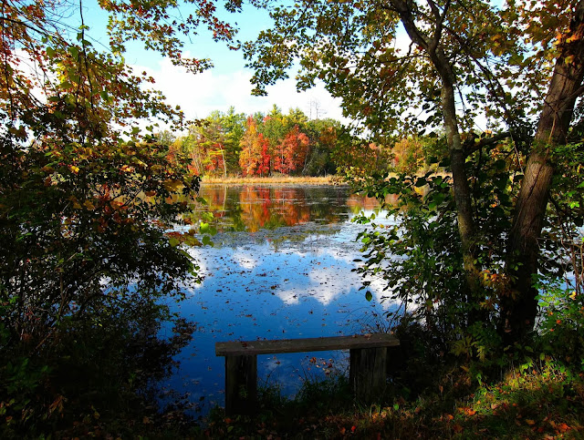 What a string of splendid days!  I almost hope we'll get an inclement one soon, so I will stay home and catch up a bit on housework.  But who could resist the call of the outdoors when the sky is so blue, the air is so balmy, and the autumn colors are coming on fast?  Even my husband consented to join me on a walk at Moreau Lake on Monday, after I promised I wouldn't stop every five minutes to take any photographs.  Well, maybe just a few . . . .