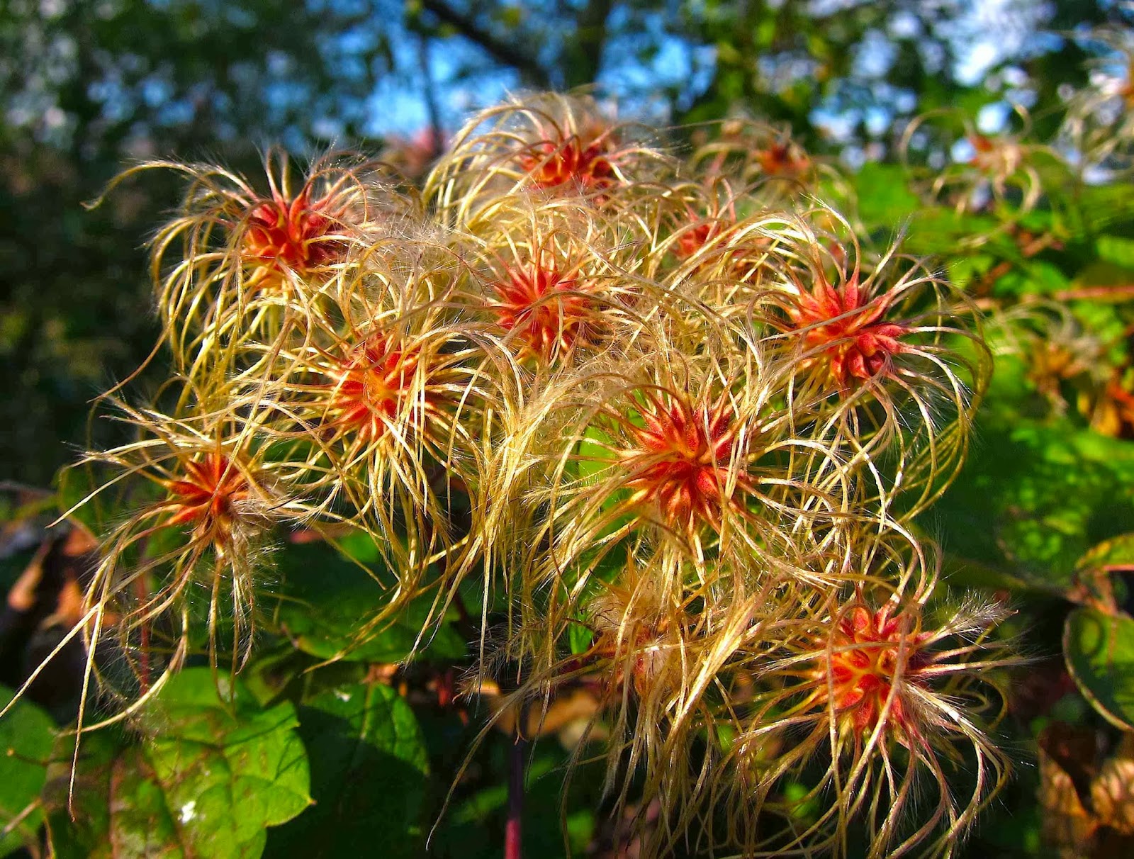 Our native Clematis vine, called Virgin's Bower, produces dainty white flowers in summer and fluffy white puffs of seeds as autumn wears on.  This intermediate stage is the most colorful one of all, with its peachy-coral seedheads and silky long blond tresses.