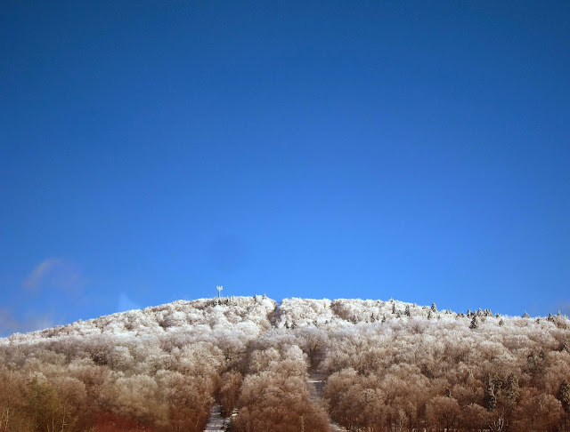 The mountains begin to reach up to the sky between Bennington and Wilmington, Vermont. This clear sunny day was cold enough that the hoarfrost was still on the mountaintop trees at midday.