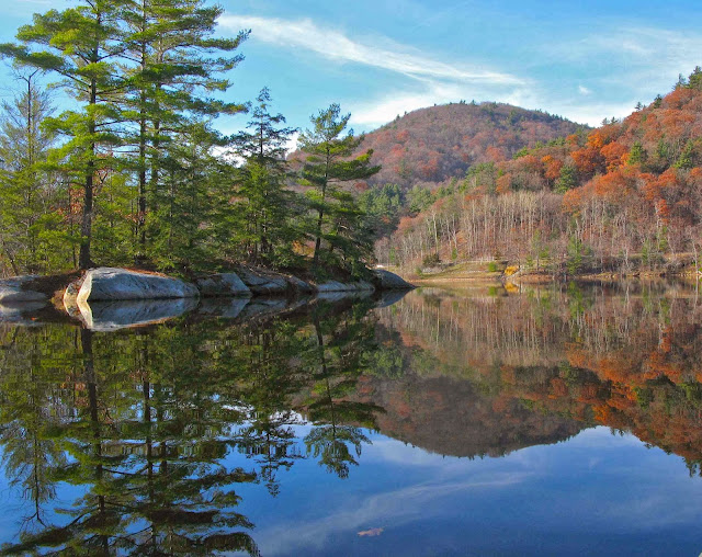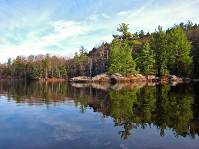 I knew there was a reason I hadn't stowed my canoe as yet.  Yes, I had a hunch there'd be one more perfect paddling day, so my boat stayed strapped to the top of my car, just waiting, waiting, waiting.  Well,  that day happened on Friday.  Warm sun, no wind, blue sky, and not another soul around to roil the river's still surface.  I slipped my boat into the sheltered waters that hide out behind a large island,  dipped my paddle into the cold clear water, and glided effortlessly into Paradise.