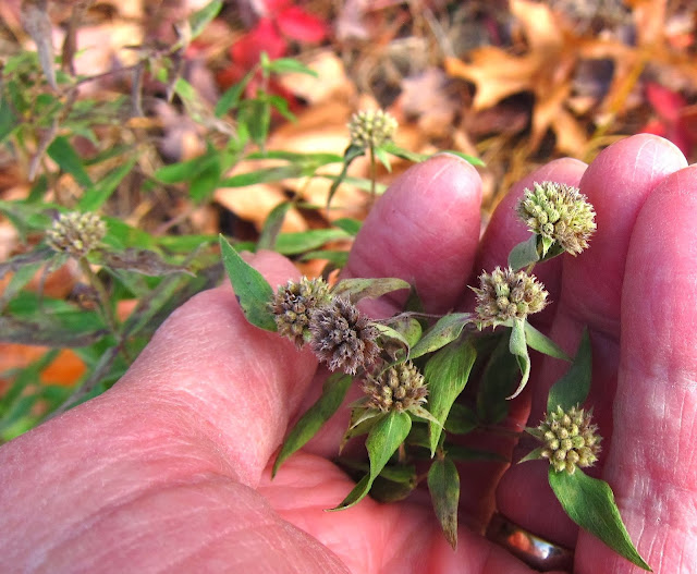 It's always a good day for a walk around Moreau Lake, especially on days as beautiful as it was yesterday. But this time I had a special reason for walking this shoreline, for I wanted to revisit the Whorled Mountain Mint I found along the shore this fall. (See my post for September 9.) Except that then, I wasn't sure of its name. But now I knew for sure, since I had just heard from Steve Young, chief botanist with the New York Natural Heritage Program, that this is, indeed, the endangered species of mountain mint he thought it might be, Pycnanthemum verticillatum var. verticillatum. I'm happy to report that it was looking still very healthy yesterday, with many of the dozens of plants still bearing green leaves.