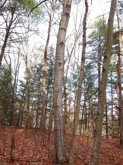 This southern Saratoga County woods provided a perfect laboratory for studying our native birches, since we found all four species -- Black, Gray, Yellow, and Paper -- in close enough proximity for easy comparison. Here, a Yellow Birch (left) and a Black Birch grow side-by-side, with the Yellow's bark displaying the golden color and tight little curls that are typical of its species, and the Black's displaying the darker color and large loose plates it acquires at it matures. All of the birches have horizontal lenticels (openings in the bark that allow the tree to breathe).